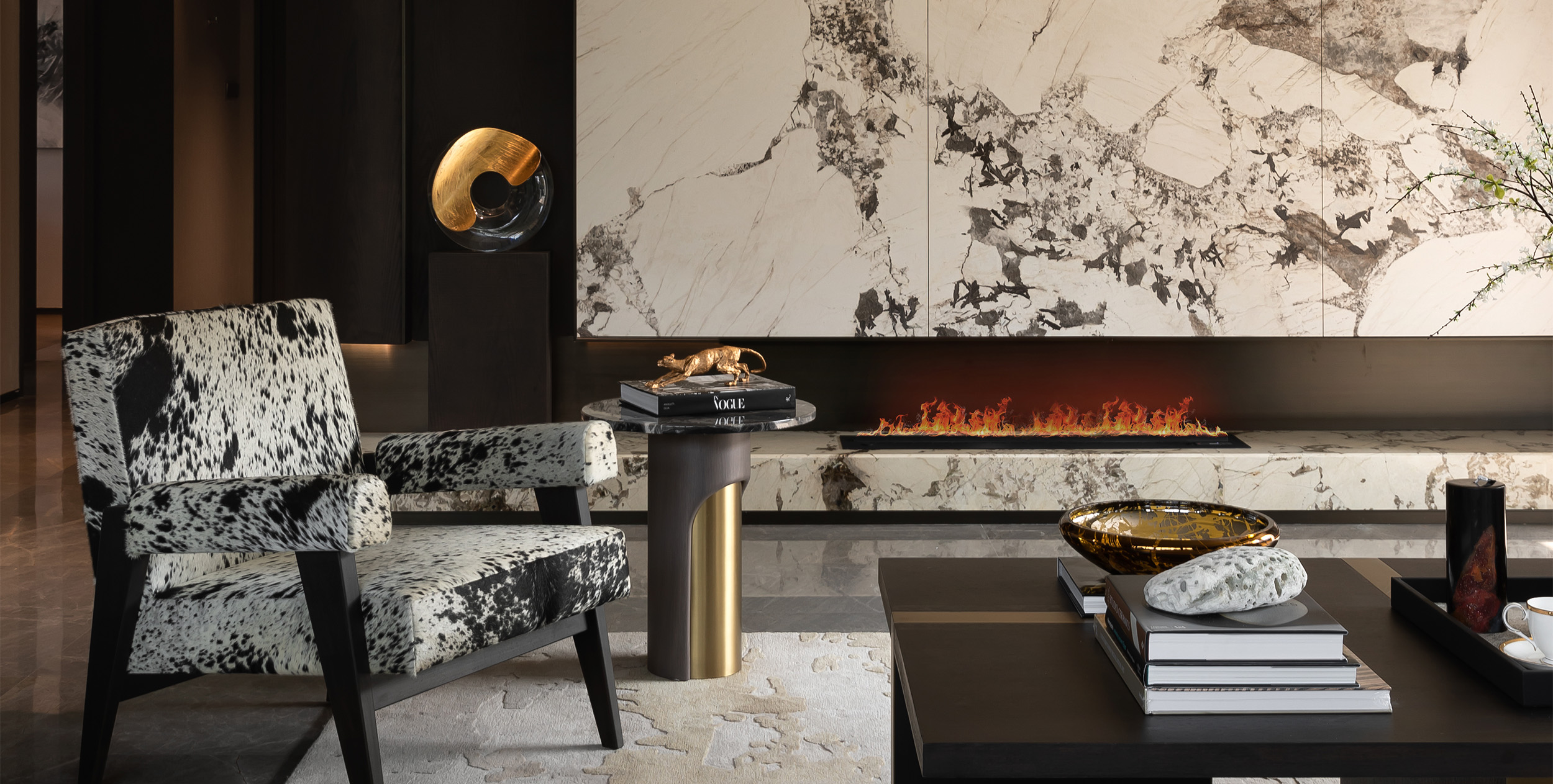 The L-shaped sofa and horsehair armchair enclose a cozy and relaxed seating area, while the marble background wall gracefully stands on the other side, infusing the space with peaceful and elegant hues. Enhanced by the embellishment of artworks, the texture and aesthetics of the space are reflected in these fine details.