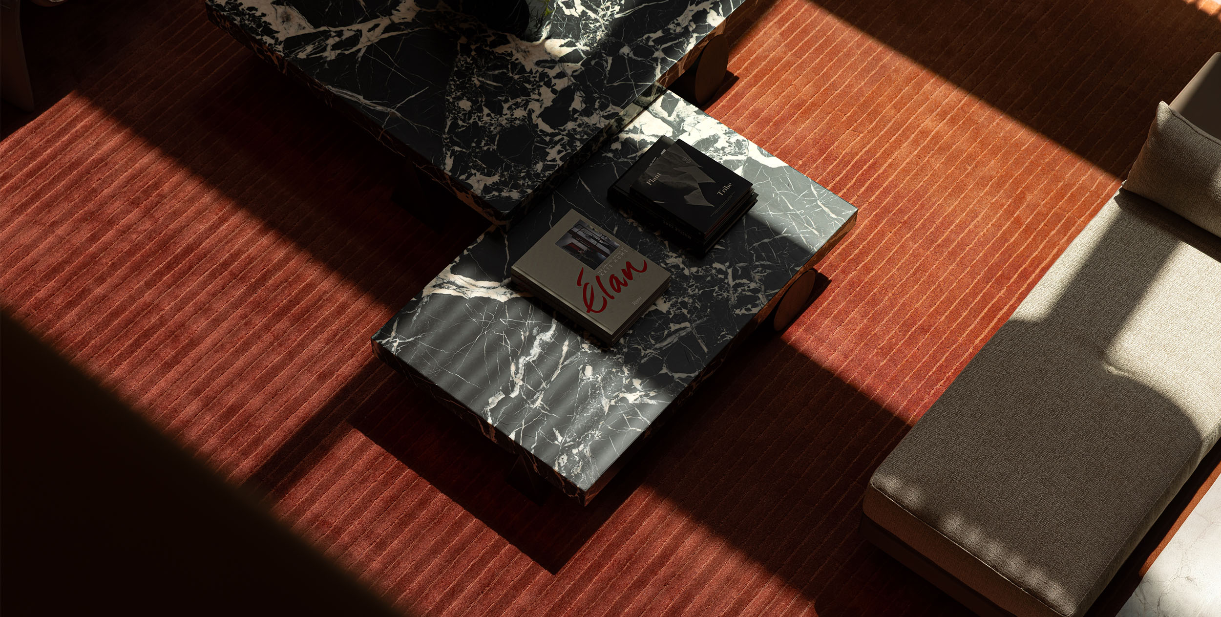 In the living area, floor-to-ceiling windows frame the courtyard view. Skylights above cut sharp shadows across the room that shift with the sun. The Italian Taccia lamp finish contrasts with fabric pendant lights, while veined marble walls keep the mood grounded. At noon, the kitchen stays cool and clean.