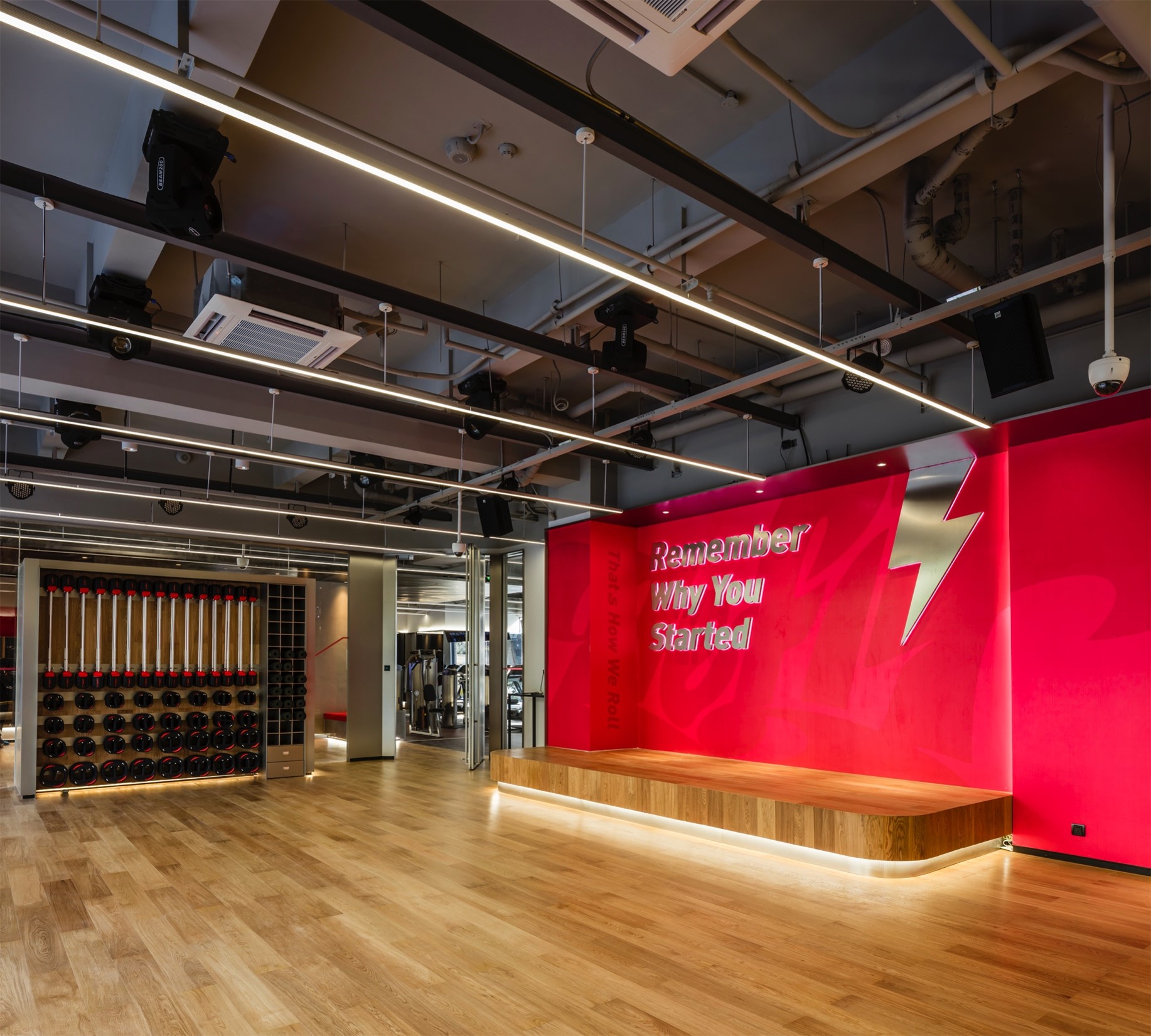 The ubiquitous lightning symbol is the most conspicuous mark of the Le Fit fitness center . The emergence of the red and silver lightning symbols standing for speed and passion impresses everyone. It indicates stylish and dynamic environment in the gym, and also narrate a lifestyle engraved with the spirit of Le Fit. The image of lightning has also been processed as oblique lines which are largely used in the venue. These powerful and sturdy lines highlight the sense of power and movement in the design, meanwhile, break the flatness and monotony of space and form a rhythmic echo.